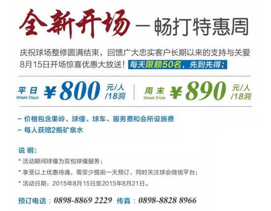 每年的封场休整,是为了让球场休养生息,保持更加完美的状态,本年度的封场期将于8月14日圆满结束,8月15日开场营业。 为了回馈广大忠实客户长期以来的支持与关爱,球会将在开场第一周每天限量推出50个特惠名额,敬请期待并提前预约!