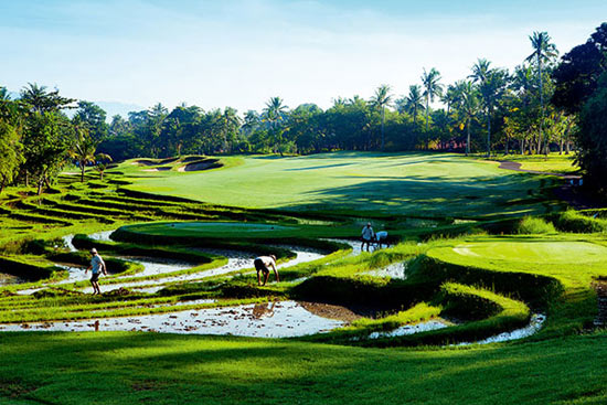 尼瓦纳高尔夫俱乐部在位于巴厘岛南岸的艾美高尔夫度假村内,是格雷格·诺曼在巴厘岛的唯一18洞设计,当地特色明显,梯田悬崖齐飞、沟壑海风并行。这座总长6805码的18洞球场最大的特点是变化丰富,山景海景交融。第一洞就是惊喜:梯台与梯台之间稻田齐整而茂盛,两者好像天然生长在一起。梯田是巴厘岛的特色,大白鲨将前4洞都置于稻田之中。球场也很应景,将球童的服装设计成农夫装扮,而真正的农夫正在前方弯腰耕作。球落进了稻田?挽袖伸手往田里一摸,摘水稻似的!这一场球注定充满了开垦和乐趣感。