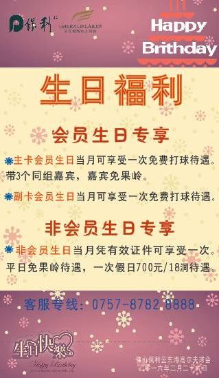 佛山保利云东海高尔夫球会为感谢各界球友长期以来的支持,特推出会员生日福利优惠:
