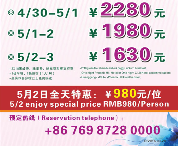 980元/位 东莞凤凰山高尔夫球会五一钜惠