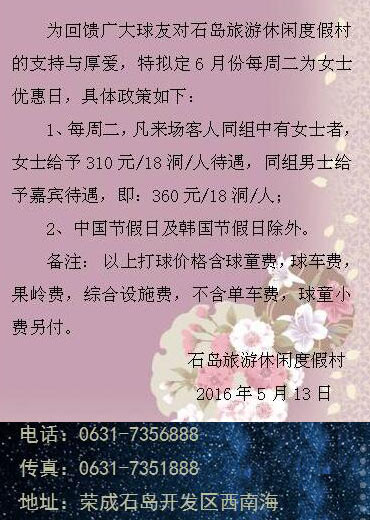310元/18洞 威海石岛高尔夫球会6月女士优惠