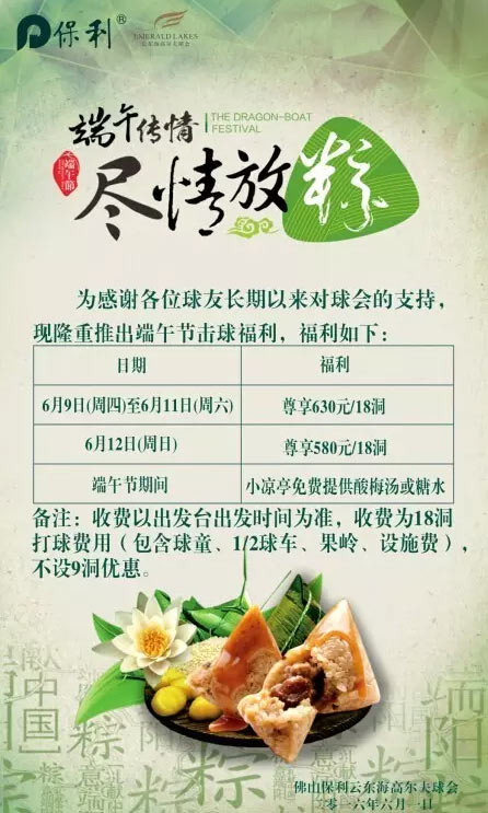 端午传情,尽情放“粽",佛山保利云东海高尔夫球会全体同仁祝各位会员、球友端午节快乐,球技进步!