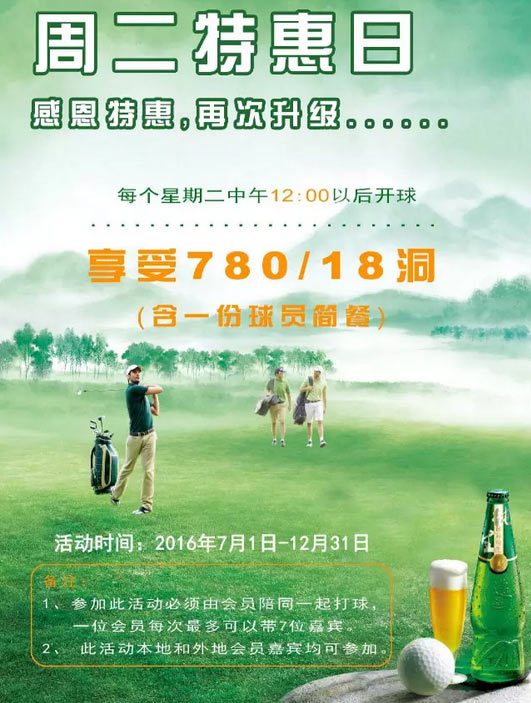 感恩回馈,再次升级!自从春城推出周一至周四的闲置时间以来,深受会员及嘉宾的青睐,大家纷纷感慨:机会难得,抢订激烈! 为了回馈球友,春城现推出周二特惠日: