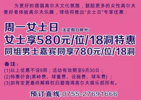 为更好的提倡高尔夫文化氛围,鼓励更多的女性高尔夫爱好者体验高尔夫乐趣,碧海湾高尔夫球场特推出“周一女士日”特享优惠活动: