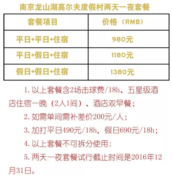 980元/人 南京龙山湖高尔夫球会2天1夜套餐