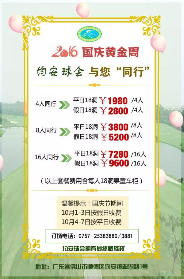 1980元/4人 佛山顺德均安高尔夫球会国庆优惠活动