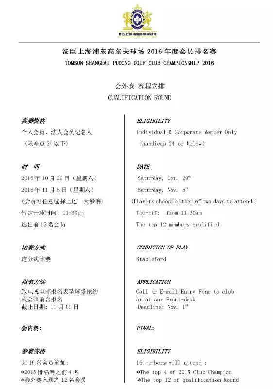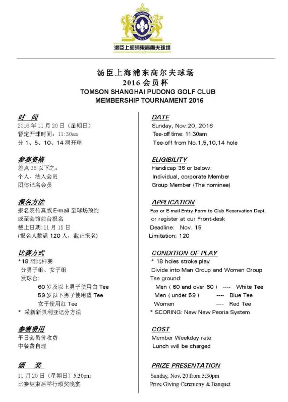 报名-汤臣上海浦东高尔夫球场2016年会员杯赛