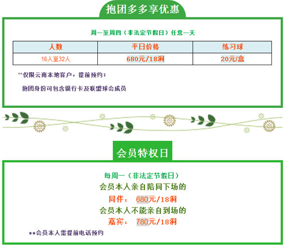 昆明的冬不同于北方那样白雪皑皑,其恰到好处的绿别有风情…… 活动时间:2016年11月01日--2016年12月31日 早球 每周一至周四(非法定节假日),早上10:30以前下场 嘉宾及访客:650元/18洞 **特价活动仅接受18洞预订且前台现付价
