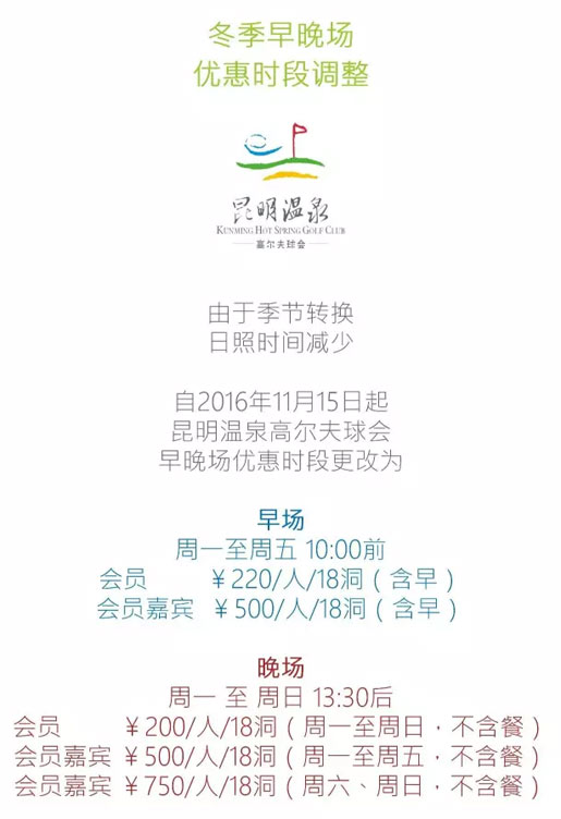 220元/人 昆明温泉高尔夫早晚场优惠换季调整