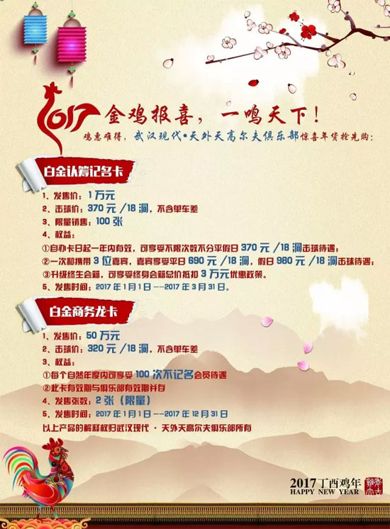 金鸡报喜、一鸣天下!武汉现代.天外天感谢一路有您!为答谢您及球友一直以来对球会倾力支持,特此回馈劲爆年货,您值得拥有!