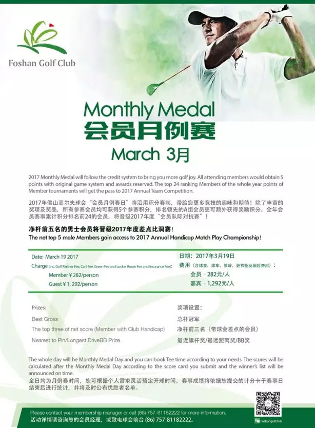 2017年佛山高尔夫球会“会员月例赛日”将沿用积分赛制,带给您更多竞技的趣味和期待!除了丰富的奖项及奖品,所有参赛会员均可获得5个参赛积分,排名领先会员更可额外获得奖励积分。全年会员赛事累计积分排名前24的会员,将晋级2017年度“会员队际对抗赛”!