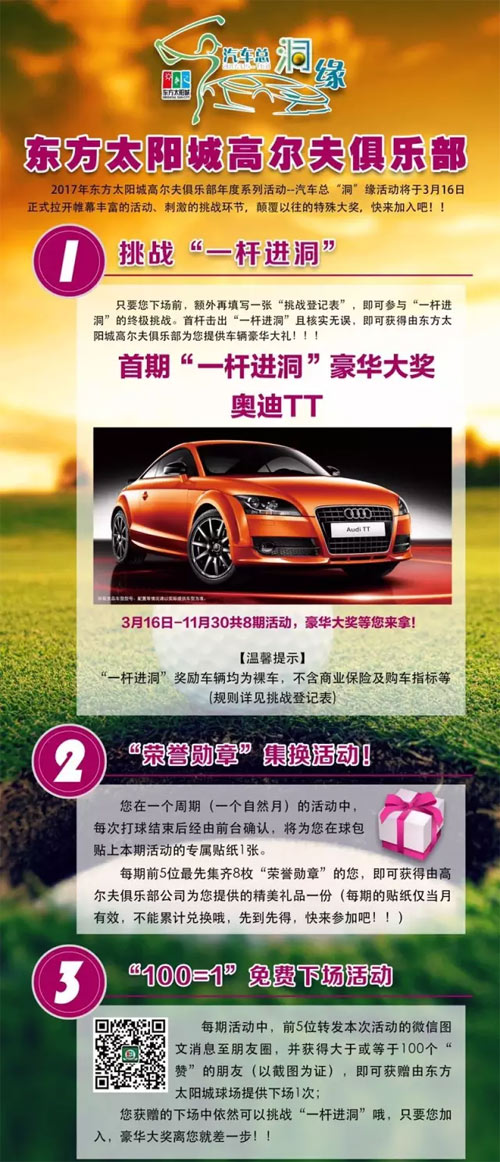 报名本次开场活动,即可参加东方太阳城高尔夫俱乐部“汽车总洞缘”一杆进洞挑战环节,奖品为奥迪TT一辆!快来参加吧!