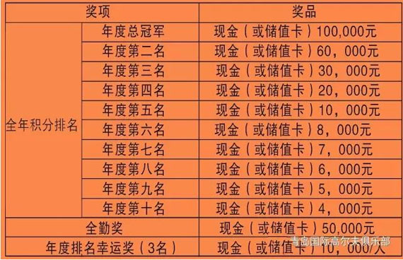 年终总决赛:本场冠、亚、季军奖、趣味奖(抽奖)、全勤奖、年度排名幸运奖(3名)、全年总积分前十名。
