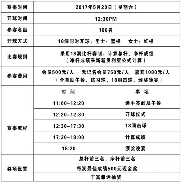 击球旺季已经到来,一年一度的小洋口“春季杯”会员&嘉宾现金争奖赛于2017年5月20日正式开打! 赛事安排
