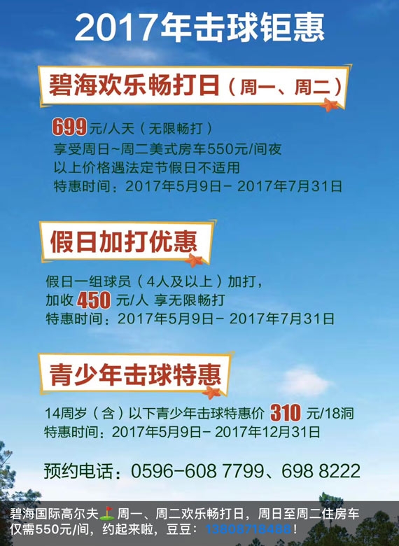 699元 漳州碧海高尔夫周一、二无限畅及优惠套餐
