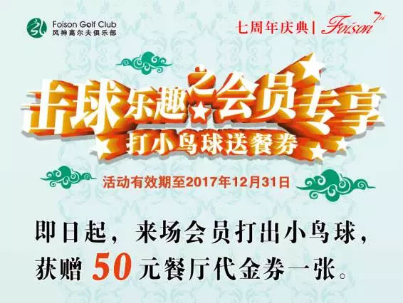 活动内容:即日起,来场会员打出小鸟球,获赠50元餐饮代金券一张。
