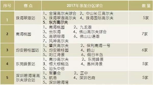 01、“茅台股份高尔夫酒”2017华南地区高尔夫俱乐部会员排名赛资格赛是一个专为华南区域球会会员所举办的赛事,本次阳江涛景所在区域赛场设置在:均安碧桂园高尔夫球会,共同参与本次资格赛的球会分别是: