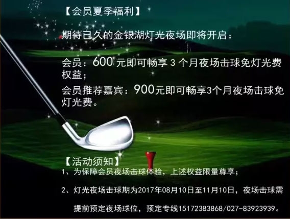为了让更多球友都能体验到金银湖灯光夜场的畅快击球,特推出灯光畅享卡,即可享受推广期内灯光费畅享待遇!价格太美我不敢看!