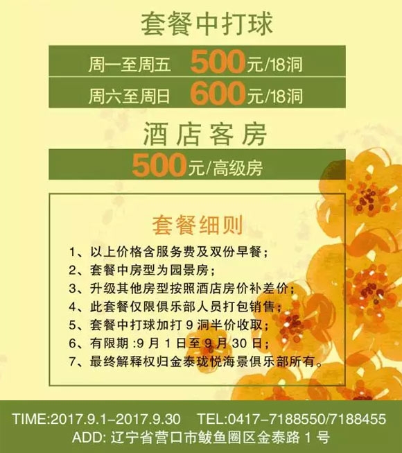 500元/18洞 营口金泰珑悦高尔夫九月酒店住打套餐