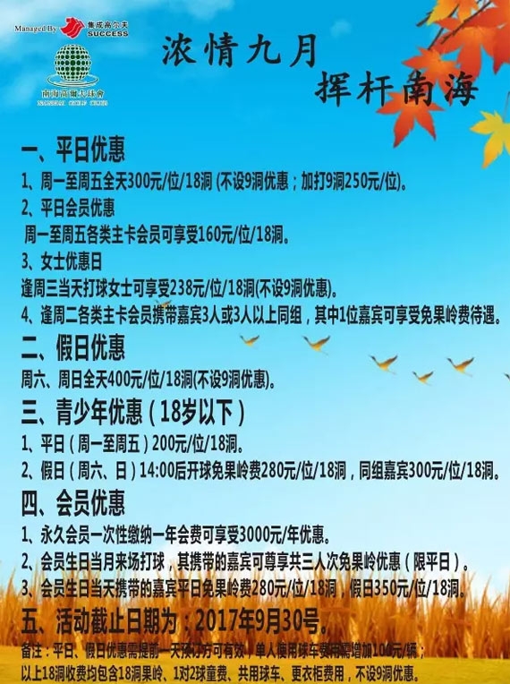 160元/18洞 佛山南海高尔夫球会9月优惠活动