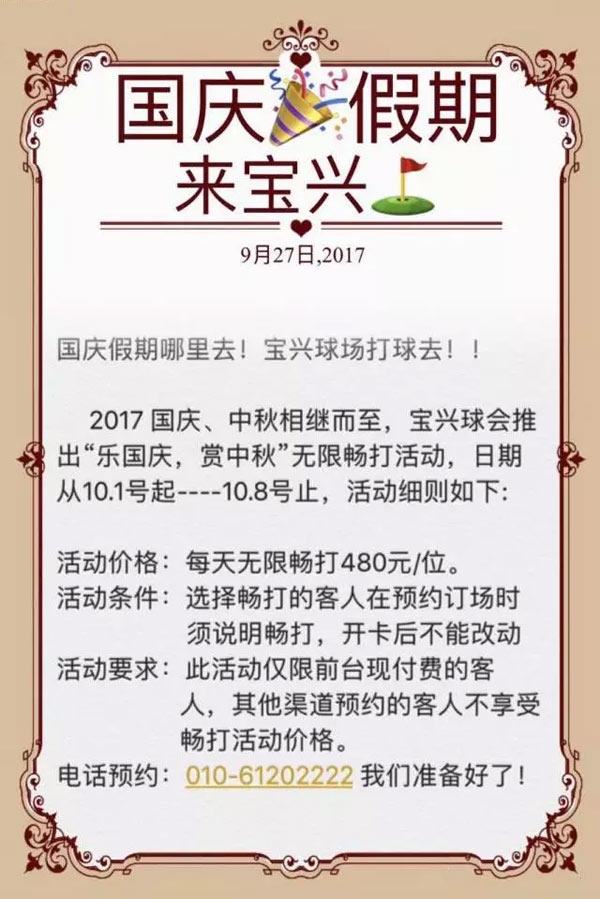 北京宝兴高尔夫球会十一假期钜惠 480元畅打