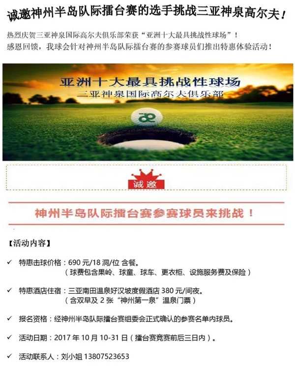 690元/18 三亚神泉高尔夫神州半岛队际擂台赛选手福利