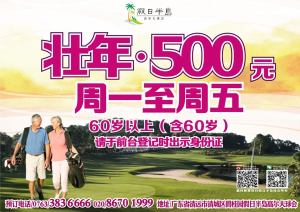 假日半岛高尔夫球会平日(周一至周五)壮年特惠:500元/18洞/位(前台出示证件登记即可尊享)