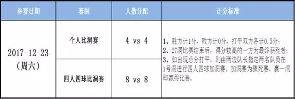 比赛分为:个人比洞赛、四人四球比洞赛。参赛人数分配及计分标准如下: