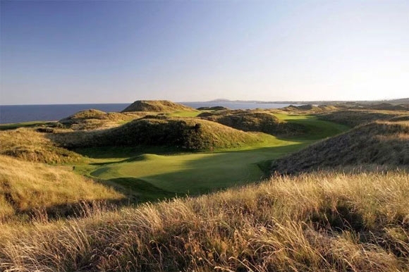 五杆洞第13洞,四个埋藏着罪恶的沙坑在左边,爱尔兰海在右边,周到地保护着596码的长长的球道。第14洞是一个障碍多多的三杆洞,长度165码,有着独特的高原果岭和巨型的沙坑。(来源:高尔夫杂志)