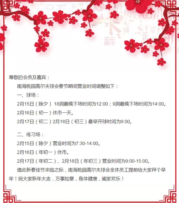 佛山南海桃园高尔夫球会2018春节营业时间调整
