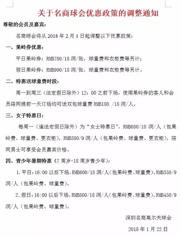 深圳名商高尔夫球会2018优惠政策调整通知