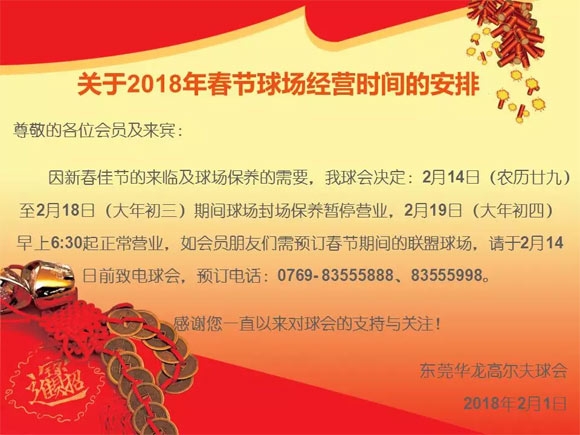 东莞华龙高尔夫2018年春节球场经营时间安排