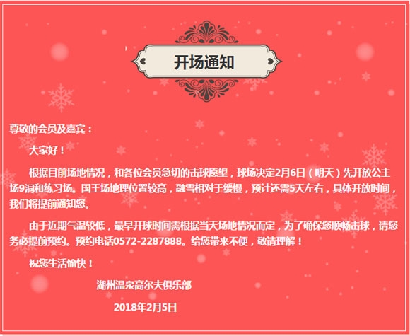 浙江湖州温泉高尔夫俱乐部2月6日开场通知