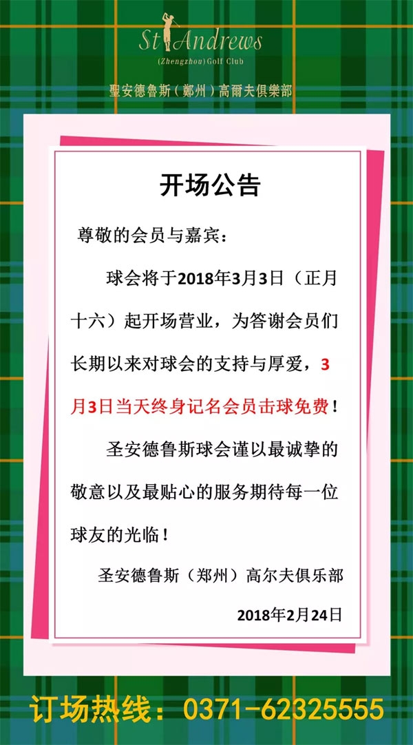 郑州圣安德鲁斯高尔夫球会3月3日开场营业公告