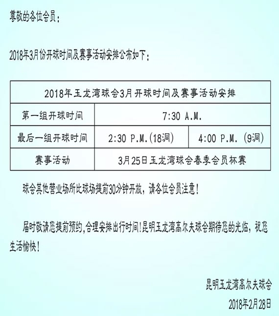昆明玉龙湾高尔夫球会3月开球时间及赛事活动安排