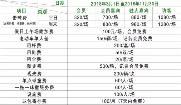 2、此价目表中“场”指18洞的收费价格。如打9洞,则击球费、租赁费、陪场费按5折结算