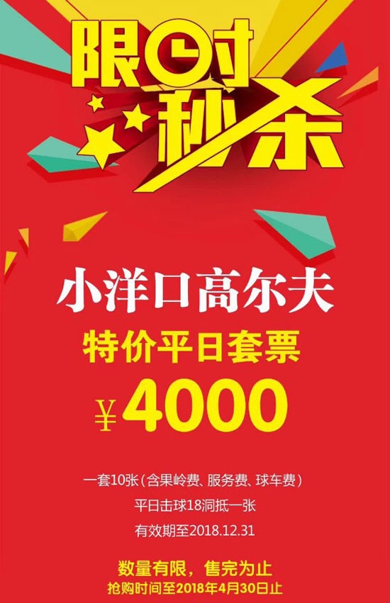 为回馈各位尊敬的会员&嘉宾十年来对小洋口高尔夫的支持与关心,本俱乐部推出小洋口高尔夫特惠平日套票,数量有限,欢迎抢购!