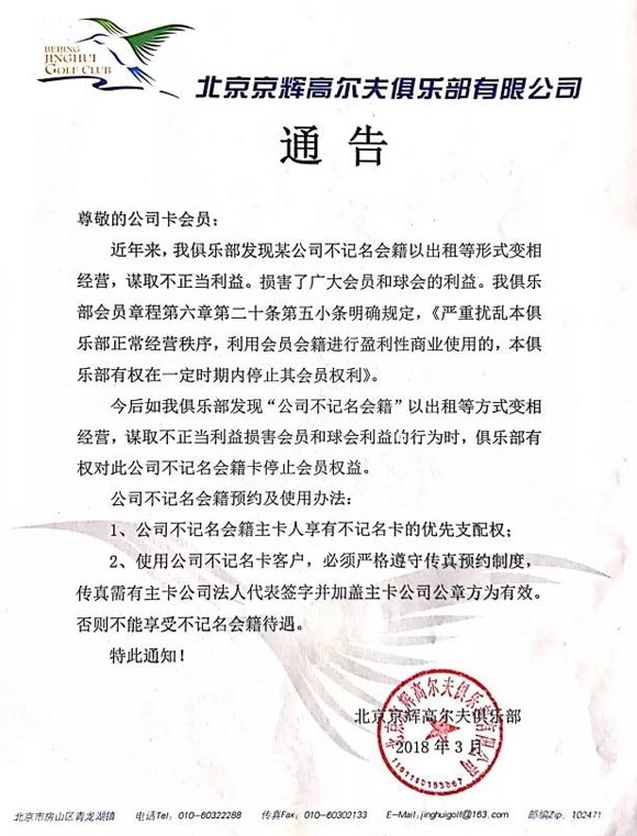 北京京辉高尔夫《关于严禁使用不记名卡牟利的通告》