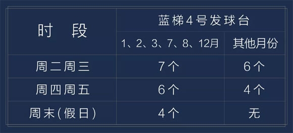 球场优化梯台配置取消黑梯,蓝白红三个梯使用现有四个发球台(简称“1-4号发球台”)优化摆放,并根据发球台养护程度进行调整使用。