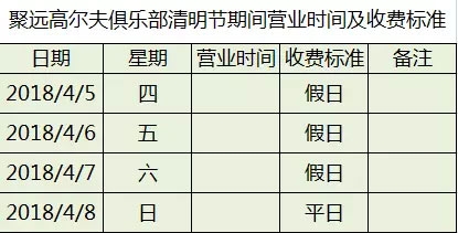 根据国务院办公厅关于2018年部分节假日安排的通知:2018年4月5号至7号放假调休,共三天。聚远高尔夫俱乐部清明节期间收费标准如下: