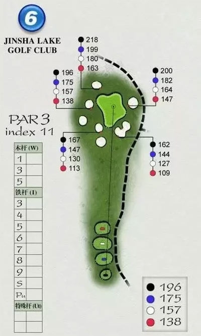 这一个三杆洞以经典的炮台果岭设计成为整个球场的标志性球洞。由于周边有七个三四人高的沙坑环伺,被称为“七星伴月”。在这一洞开球时必须把果岭高度计算在内,否则一旦进入沙坑即如掉进深渊,很难一杆就救上果岭。此外,6号洞果岭大致分为三层,上果岭的落点如果与洞位不在同一个层面就预示着接下来在果岭上不能掉以轻心。