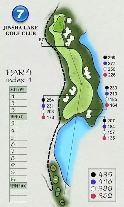 7号洞是全场难度最大的四杆洞。在7号洞的第一杆过水,落点必须要在180码以上。如果再有逆风,这对差点高的选手来说并非易事。虽然7号洞是全场唯一一个看不见果岭的球洞,但它的难度并不在此。果岭前连绵巨大的三个沙坑将难度大幅提高,同时416码的上坡距离更给球员们出了难题。