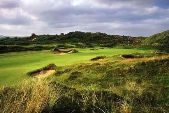 倚眺高大巍峨的莫恩山脉,傍依邓德拉姆海湾,跟其他天然球场不同,这里没有传统意义上的前九和后九洞的规划设计,因为它们之间被一条天然曲线明显分开:弧线外的一半靠近蓝色爱尔兰海,比弧线内的部分多了天然海滨沙土,沙丘也大出很多。漫步在第一个球道上,汹涌的海浪声阵阵袭来,毕生难忘。