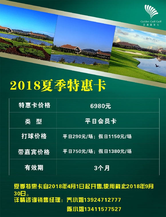 6980元/张 珠海金湾高尔夫球会2018夏季特惠卡