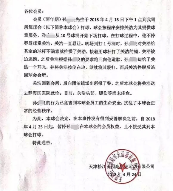 昨日,有球友在其微博上po了一张天津某球场的一张通告。