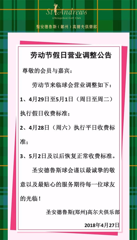 郑州圣安德鲁斯球会五一劳动节假日营业调整公告