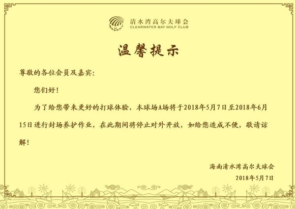 海南清水湾高尔夫球会A场封场养护作业通知