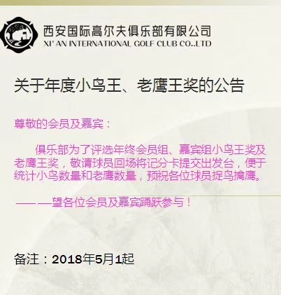西安国际高尔夫球会年度小鸟王、老鹰王奖的公告