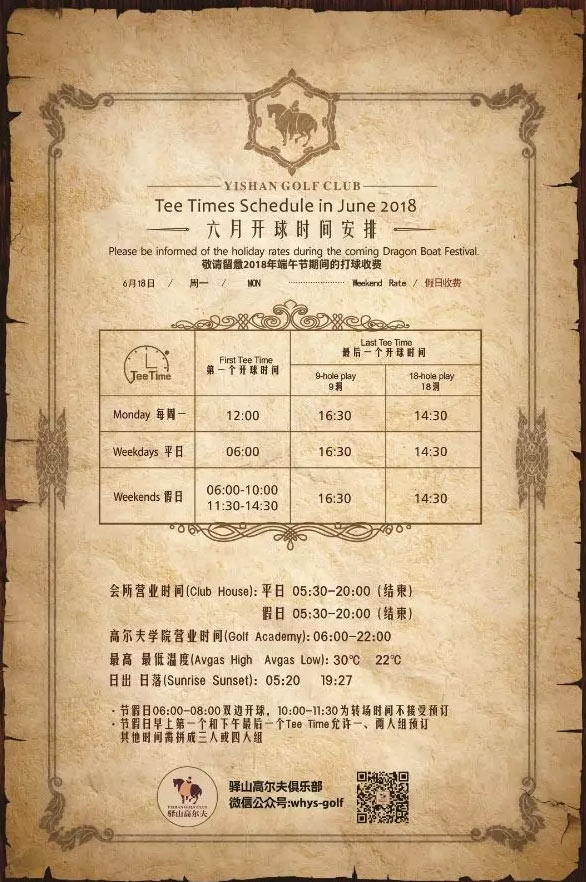 驿山高尔夫俱乐部六月开球时间如下,请您注意端午节收费标准: