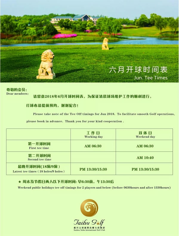 苏州太湖国际高尔夫俱乐部六月开球时间表